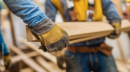 Construction laborer lifting a heavy beam into place. Featuring teamwork and strength