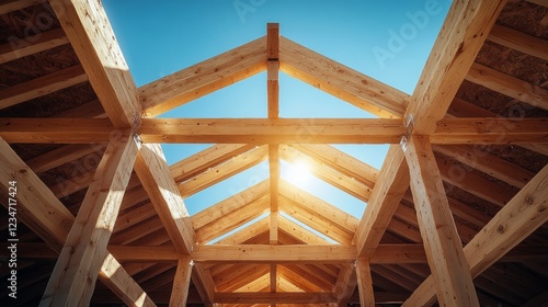 Construction of a roof made of wooden beams. An unfinished frame structure with a view of the sky. View from inside