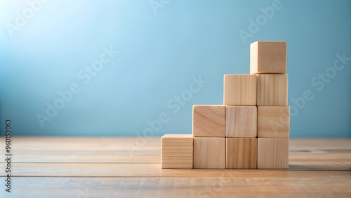 Construction of wooden blocks on wooden floor. Wooden cube blocks, empty space on blue background