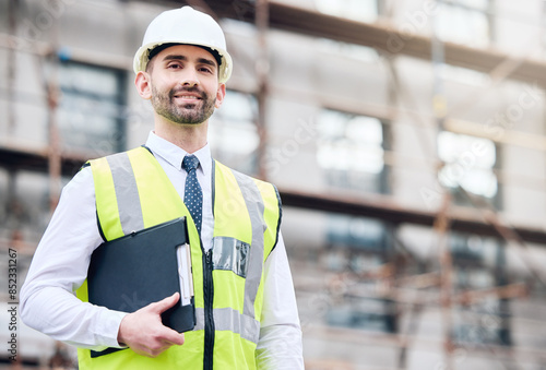 Construction portrait, man and architect with clipboard for building inspection and project management with ppe safety. Engineer guy, paper or checklist in city for property maintenance or renovation