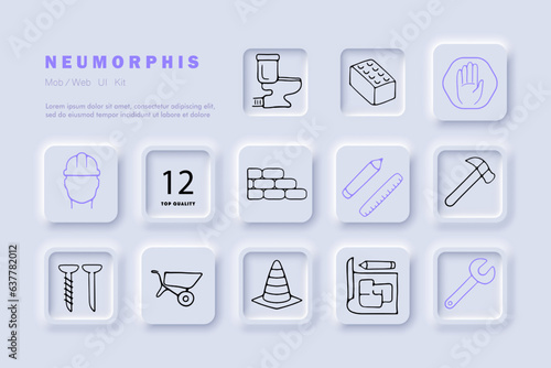 Construction site line icon. Toilet bowl, brick, stop sign, key, hammer, hard hat, builder. Neomorphism style. Vector line icon for Business