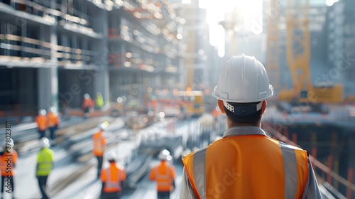 Construction site with workers in safety gear, supervised by a foreman. Modern urban building project, efficient teamwork, and progress.