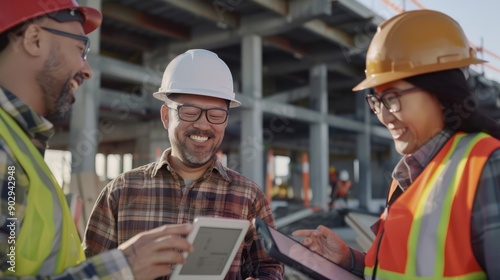Construction, teamwork, and pals giggling on a tablet during an architecture project. Building or portrait of an engineer, designer, and technician laughing.