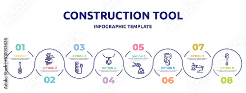 construction tool concept infographic design template. included car key, hex key, extension cord, rhinestone, furnace, multimeter, polisher, spanner icons and 8 option or steps.