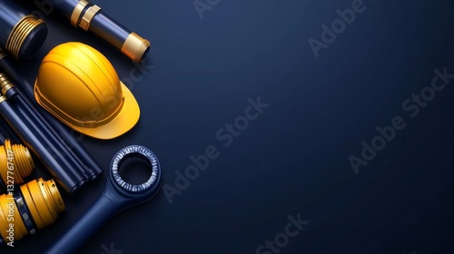 Construction tools and safety gear arranged on a dark surface, highlighting readiness for work