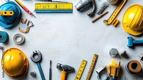Construction tools arranged around empty space.