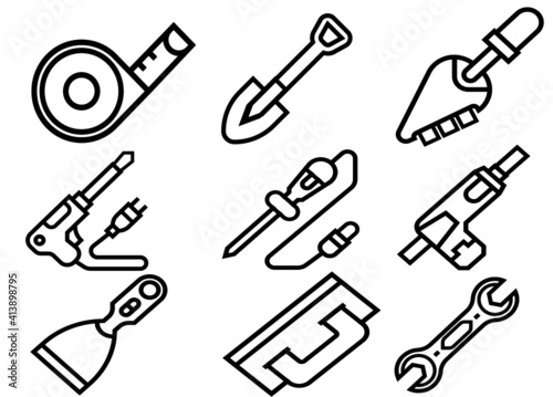 Construction tools flat line icons set. Hammer, screwdriver, saw, spanner, paintbrush vector illustrations. Outline signs for carpenter, builder equipment store. Pixel perfect. Editable Strokes.