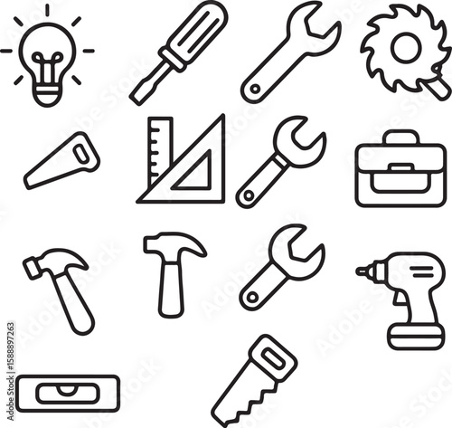 Construction Tools Icon Set – Black Line Vector Pack of Hand Tools and Equipment