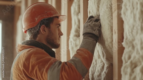 Construction worker applying insulation to a wall. Featuring attention to detail and care