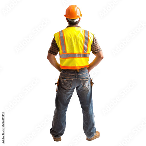 Construction worker conducts a safety check before the start of the workday. full length isolate on transparent background