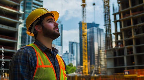 Construction Worker in Hard Hat and Safety Vest in Urban Development Site : Generative AI