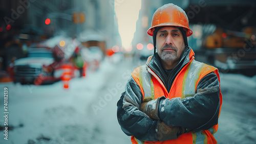 Construction worker in high visibility and reflective gear, safety vest and helmet stands with crossed arms on a snowy urban street, with blurred traffic and warning signs in the background.