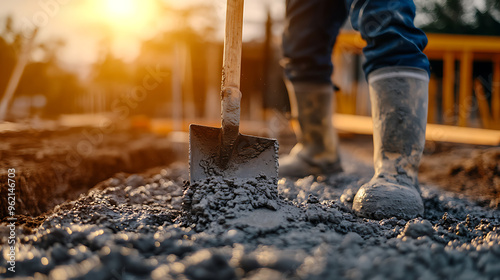 Construction worker in muddy boots using a shovel to mix concrete. The setting sun shines in the background.
