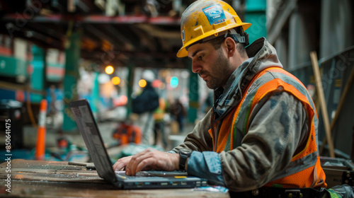 Construction worker in safety gear using a laptop on a building site, showcasing technology integration in construction.