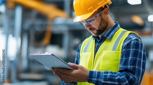 Construction Worker in Safety Gear Using Tablet in Industrial Environment with Focus on Details and Efficiency