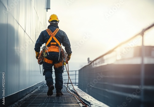 Construction Worker in Safety Harness Walking on Rooftop at Sunrise, Preparing for Building Maintenance with Tools and Equipment for Safe Operations