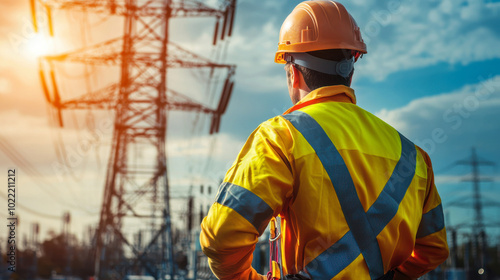 construction worker in safety helmet and reflective vest stands in front of power lines, observing infrastructure with thoughtful expression