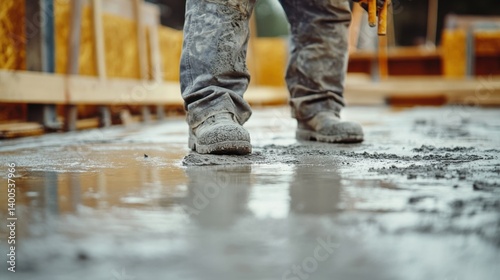 Construction worker inspecting a freshly poured concrete slab. Featuring strength and precision