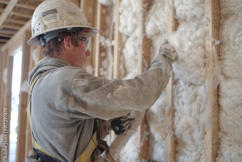 Construction Worker Installing Fiberglass Insulation in New Home Interior - Home Building, Renovation, and Insulation