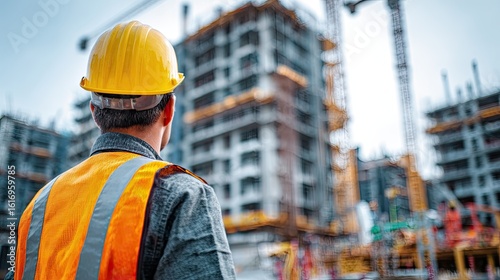 Construction worker observes a building site