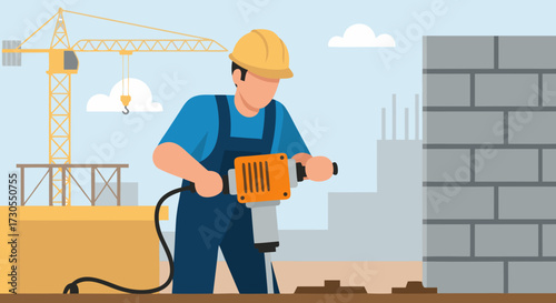 Construction worker operating a jackhammer on a site with building materials and a crane in the background, illustrating industrial labor and urban development