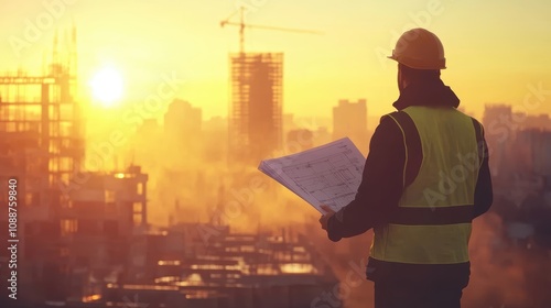Construction Worker Overlooking City Skyline at Sunset with Blueprints in Hand, Capturing the Spirit of Urban Development and Architectural Growth