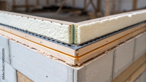 construction worker safety vest building process. Building material corner joint showing insulation and timber framing in a construction setting.