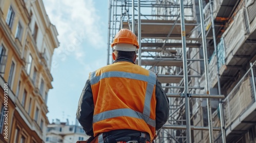 Construction worker securing scaffolding on a building site. Featuring teamwork and safety