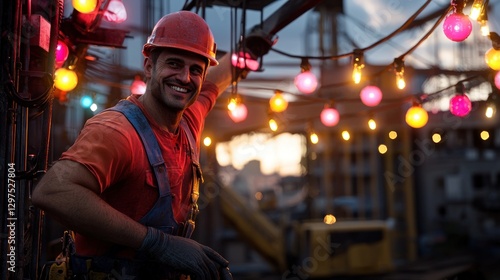 Construction worker smiling amidst colorful lights at sunset in an urban setting