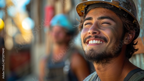Construction Worker Smiling in Hard Hat During Daytime Work