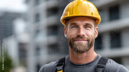 construction worker stands confidently at a building site, wearing a yellow hard hat and work gear. backdrop features modern architecture, reflecting a sunny day