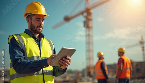 Construction worker using tablet at building site. Architect, engineer wearing hard hat, safety vest checks project on digital pad, collaborates with team. Crane background, teamwork on construction.
