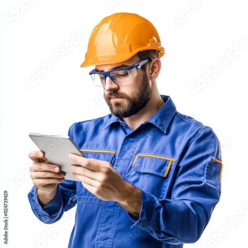 Construction worker using tablet on job site industrial environment professional activity close-up view technology in industry