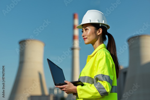 construction worker with outfit holding smart mobile tablet with factory building in background, generative AI