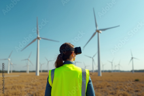 construction worker with outfit wearing VR headset with wind turbine in background, generative AI