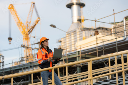 Construction workers and engineers on-site with safety helmets working on a building project for petrochemical expansion launch