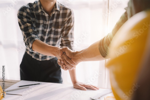 Construction workers, architects and engineers shake hands while working for teamwork and cooperation after completing an agreement in an office facility, successful cooperation concept.