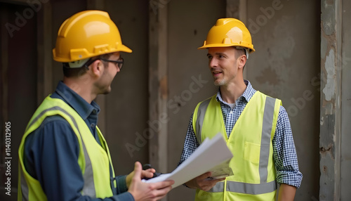 Construction workers discussing plans in building site, wearing yellow hard hats and safety vests, showcasing teamwork and collaboration