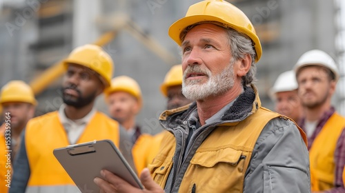 Construction workers in hardhats stand at a building site, looking up and observing the progress while holding clipboards. Focused and engaged.