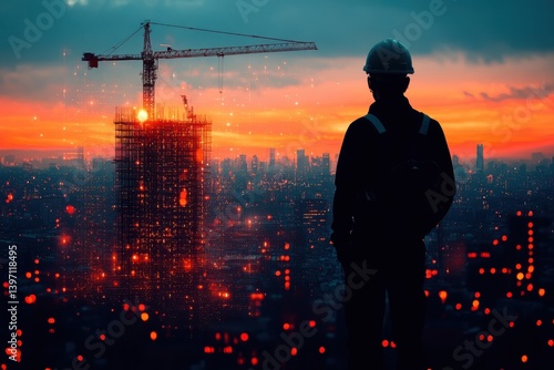 Construction workers on scaffolding, cranes, and materials on a skyscraper construction site. Building progress and urban skyline in background.