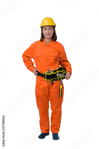 construction workers wearing Orange Protective clothes, helmet with tool belt isolated on white backround