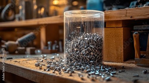 Container of Metal Bolts Spilling Over Workbench in a Workshop