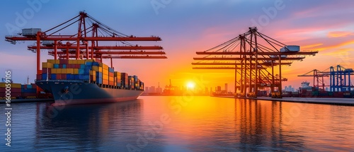 Container ship and cranes at harbor against sunset sky reflected in water.