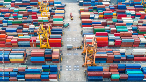 container ship in import export and business logistic.By crane ,Trade Port , Shipping.cargo to harbor.Aerial view.Top view.