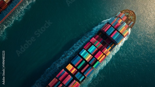 Container ship transporting colorful cargo through open waters aerial view maritime industry vibrant ocean environment