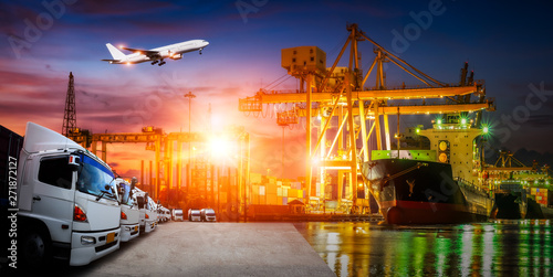 Container truck in ship port for business Logistics and transportation of Container Cargo ship and Cargo plane with working crane bridge in shipyard at sunrise, logistic import export and transport