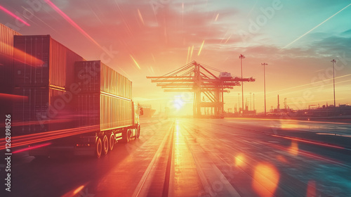 Container truck in ship port for business Logistics and transportation of Container Cargo ship and Cargo plane with working crane bridge in shipyard at sunrise, logistic import export and transport