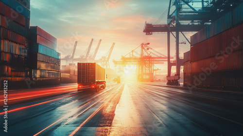 Container truck in ship port for business Logistics and transportation of Container Cargo ship and Cargo plane with working crane bridge in shipyard at sunrise, logistic import export and transport
