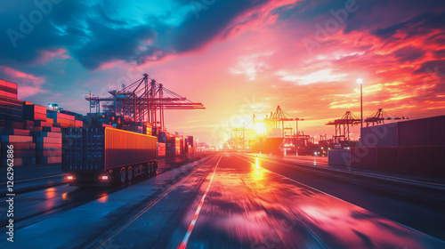 Container truck in ship port for business Logistics and transportation of Container Cargo ship and Cargo plane with working crane bridge in shipyard at sunrise, logistic import export and transport