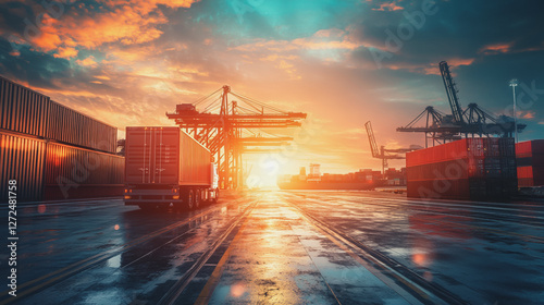 Container truck in ship port for business Logistics and transportation of Container Cargo ship and Cargo plane with working crane bridge in shipyard at sunrise, logistic import export and transport